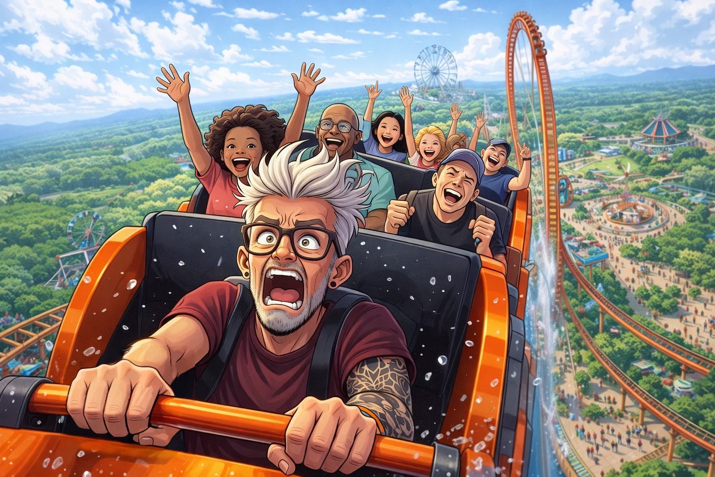I want to turn back. I don’t want to be on this ride. But I’m locked in. I don’t know how to embrace this as being fun. The cart tips over the peak. My stomach flies upward from the rush of speed as I scream into descent. Uncertain if I can get through it.