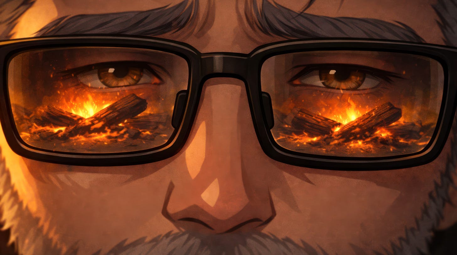 The orange glow shimmers in the reflection of my glasses. On the other side I watch the embers slowly falling into ash. The feeling inside is one of hope fading away like the light coming from the chimney. I take another sip. The firewood that’s slowly dwindling away starts to separate, not because it’s going out, but because my vision is creating two of them.